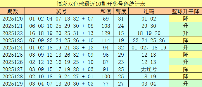 上期开奖:福彩双色球第2025129奖号开出:03 04 07 13 20 30 + 03,红球号码和值为77,首尾间距为27,包含连号:03 04。