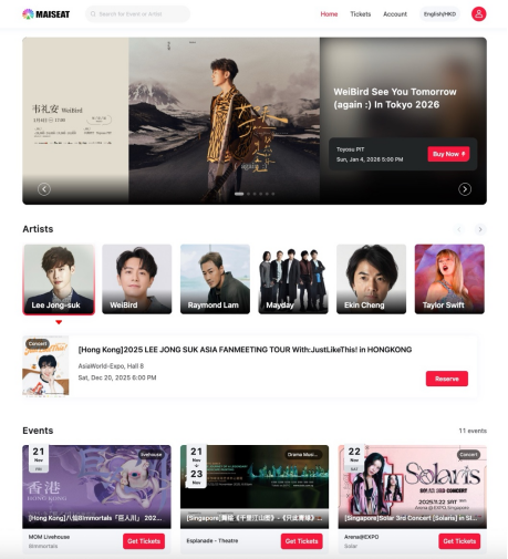 在网上搜索“大麦国际”或“MAISEAT”,即可进入大麦国际官网。可以看到,目前大麦国际已经上线上杉升《直到世界尽头》中国香港站演唱会、韦礼安《如果可以,我想和你明天再见again》日本东京站演唱会、Mamamoo女团成员Solar《Solar 3rd Concert [Solaris]》 新加坡站演唱会、岳云鹏孙越《四海福临2025相声专场》马来西亚吉隆坡站等十余场演出活动。